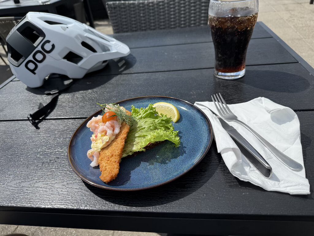 På den danska sidan började äventyret på riktigt. På ett kafe i utkanten av Helsingör blev det lite lunch – smörrebröd med spättafilé, serverat på danskt rågbröd med citron och dill.