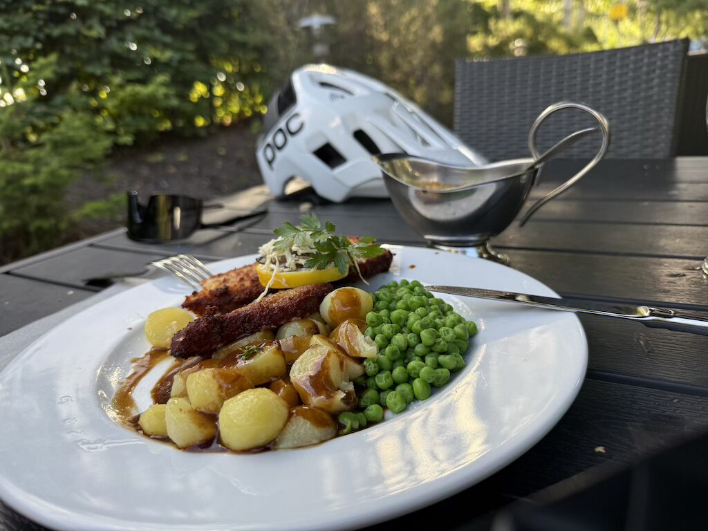 Jag tog mig vidare söderut genom några av Nordsjällands finaste partier. Skuggiga skogsvägar, smala broar, ett och annat slott som skymtade mellan träden. Det var cykling i sitt esse – omväxlande, lättkört och stämningsfullt. Middagen blev en klassisk schnitzel med potatis och ärtor samt en kall Tuborg på en uteservering strax utanför Köpenhamn.