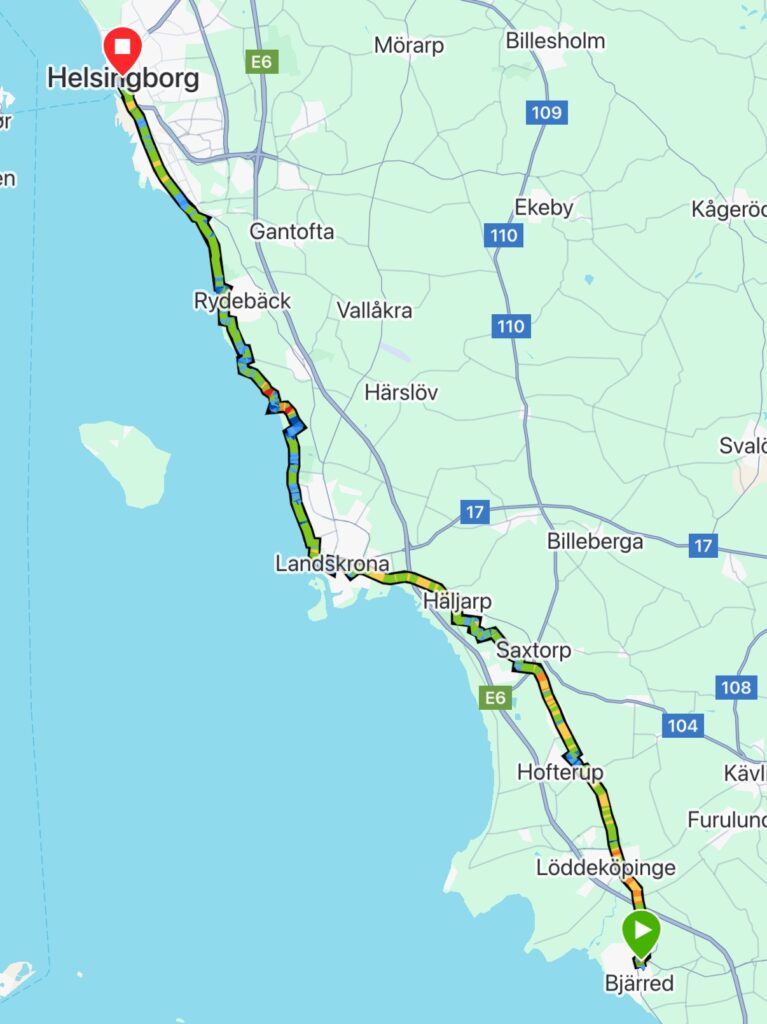 Jag startade i Bjärred en varm och stilla förmiddag. Havet låg lugnt och cykeln rullade mjukt på de första asfaltsmetrarna. Kusten norrut bjöd på klassisk skånsk cykling – långa raka sträckor, havsutsikt och ett stillsamt tempo som lät kroppen vakna i takt med färden. Jag stannade till vid en vacker strandremsa för att ta ett foto – ljuset var klart, färgerna skarpa, och hela dagen låg öppen framför mig.